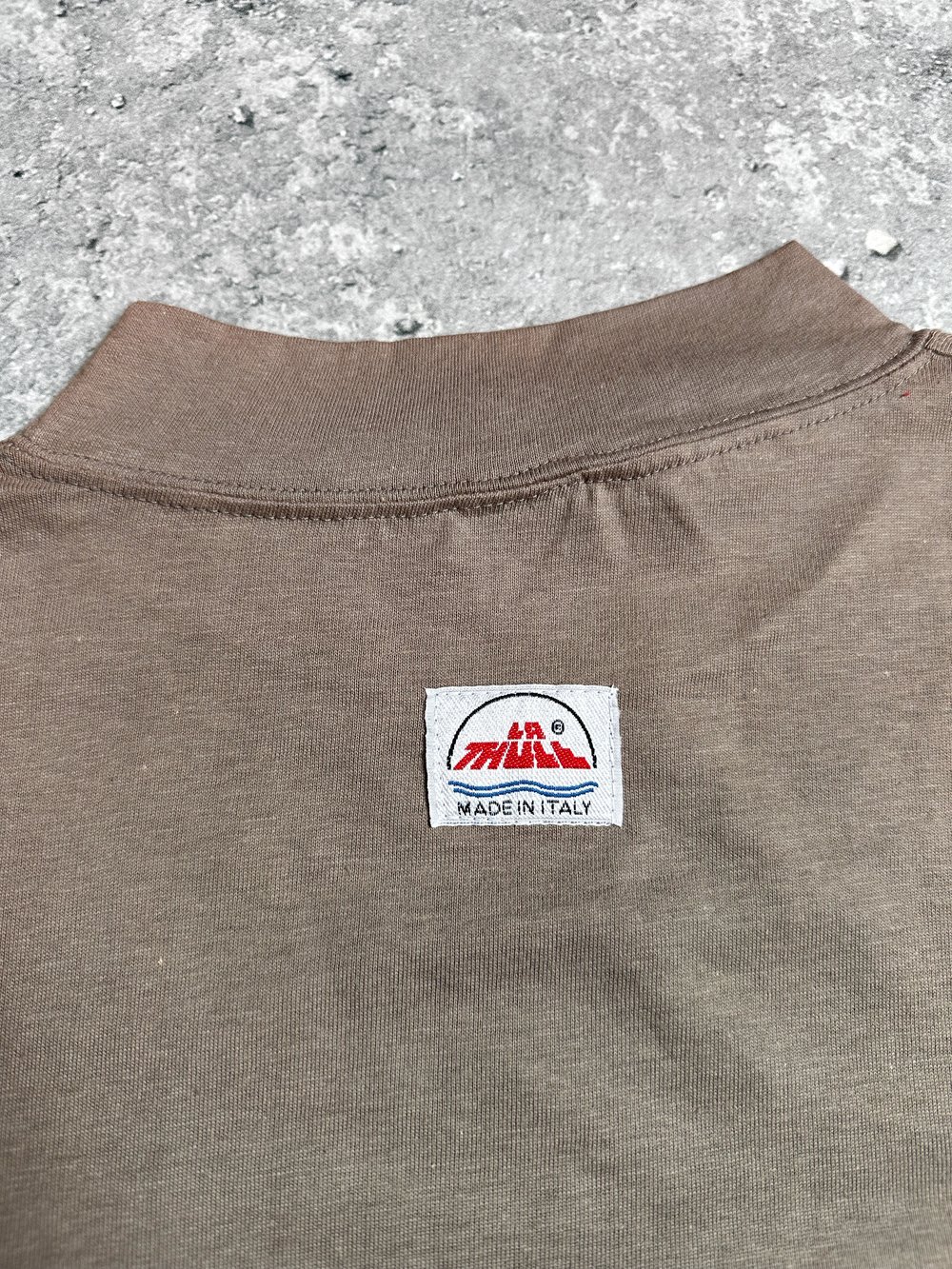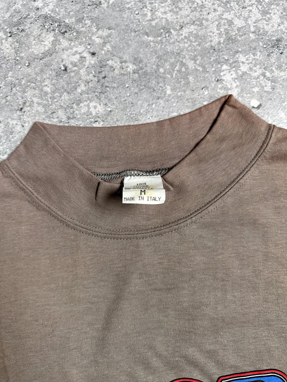 In good condition, given its age. There are no holes or stains on the shirt. The fabric feels soft and has a slightly uneven fade. Print shows no cracking. Tag is blank and says size M but fits approximately size XL.