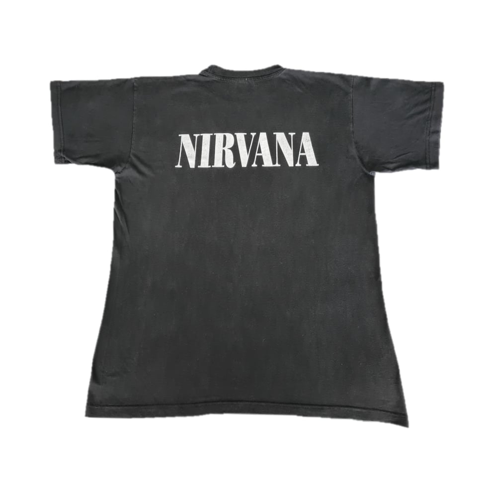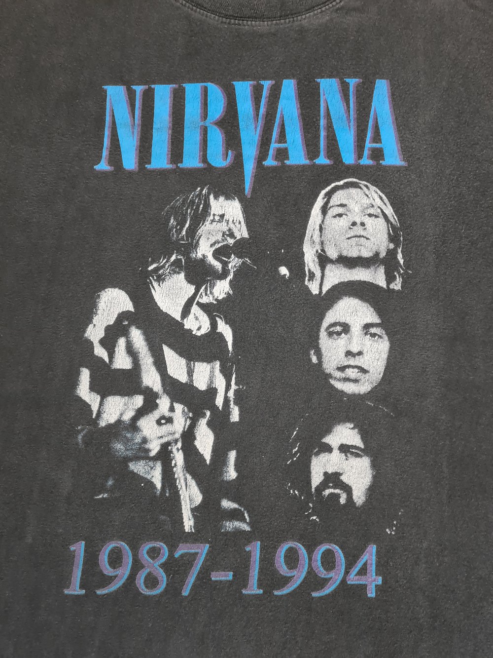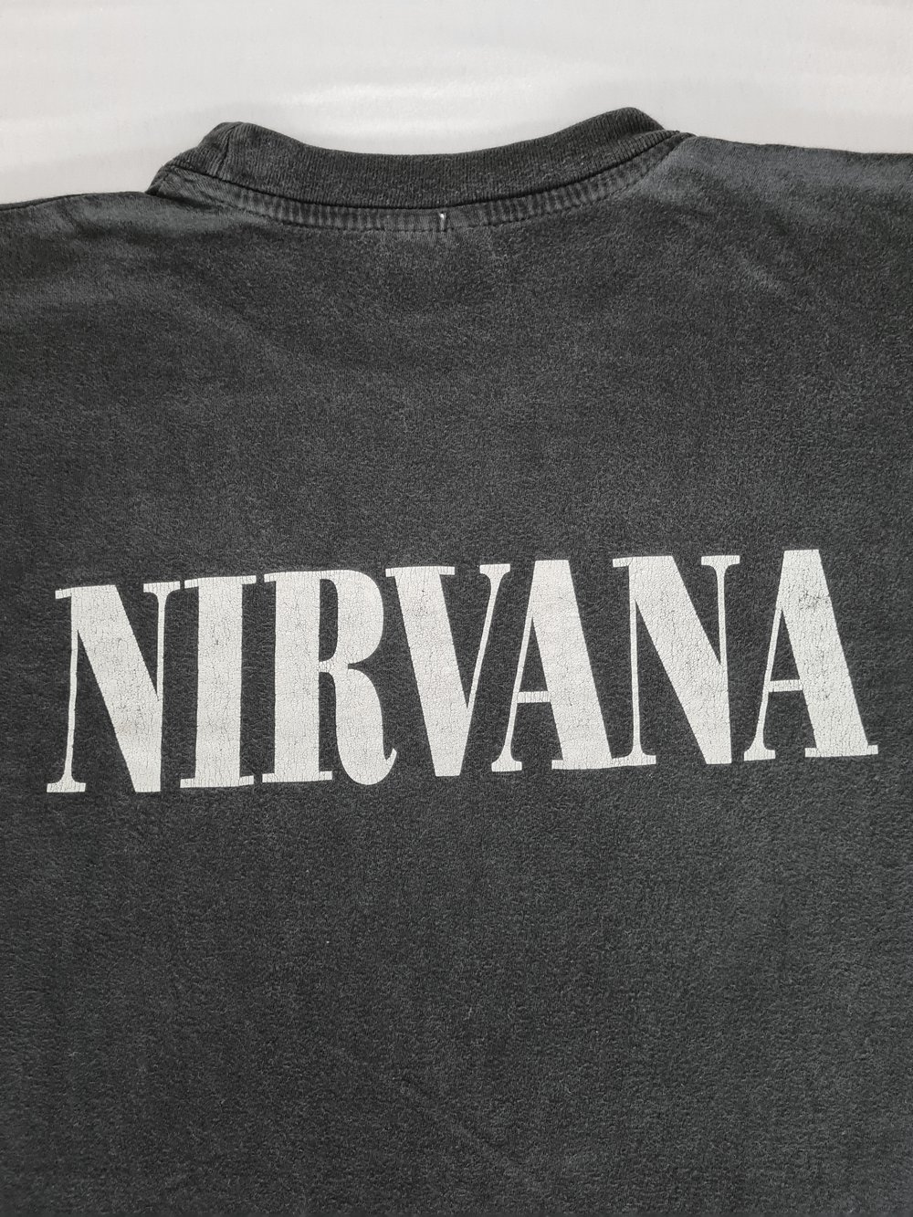 In good condition, given its age. There are no holes or stains on the shirt. The print shows minor to medium cracking. The fabric feels nice and soft, it has slightly faded. Tag has been cut but would have said approximately and says size L or XL.