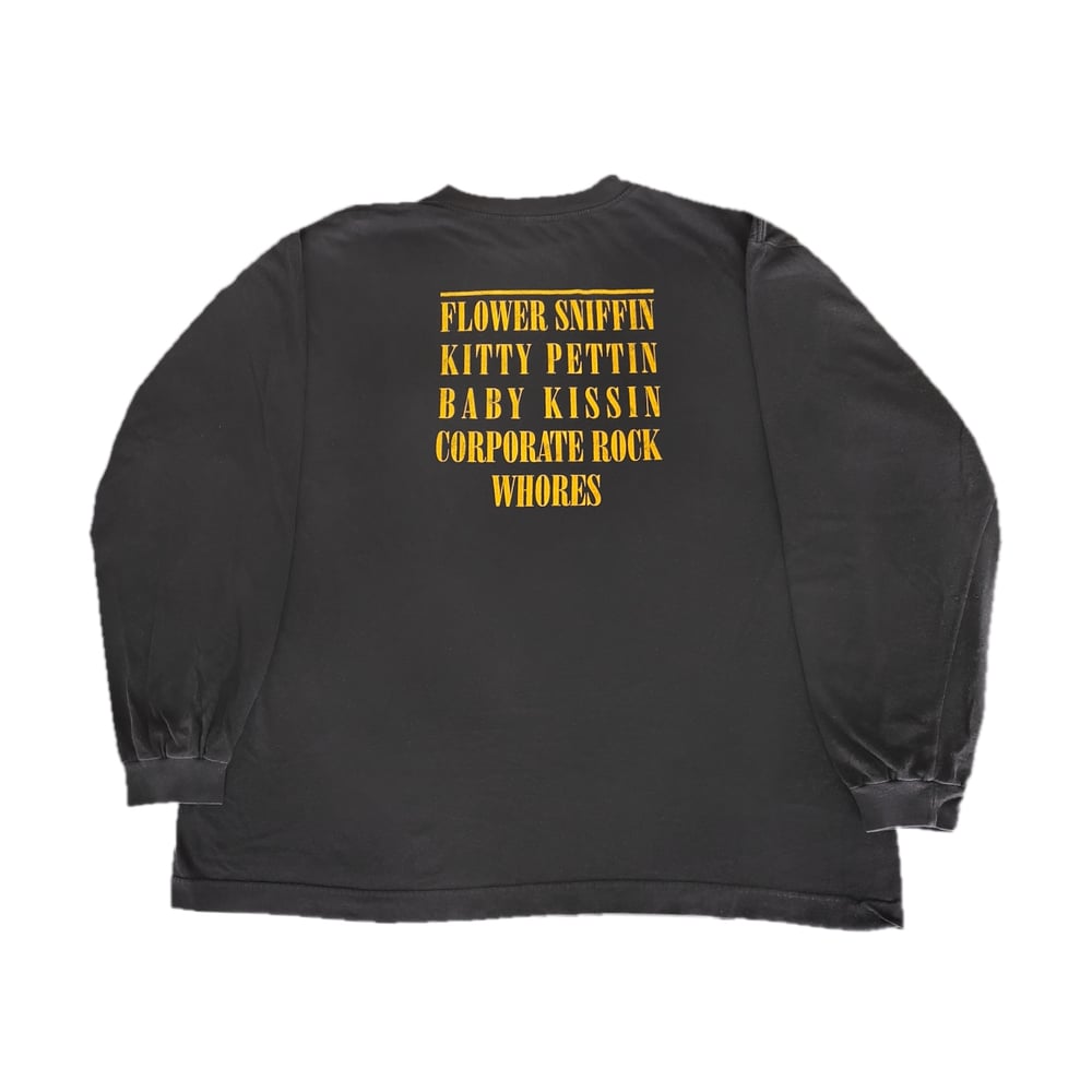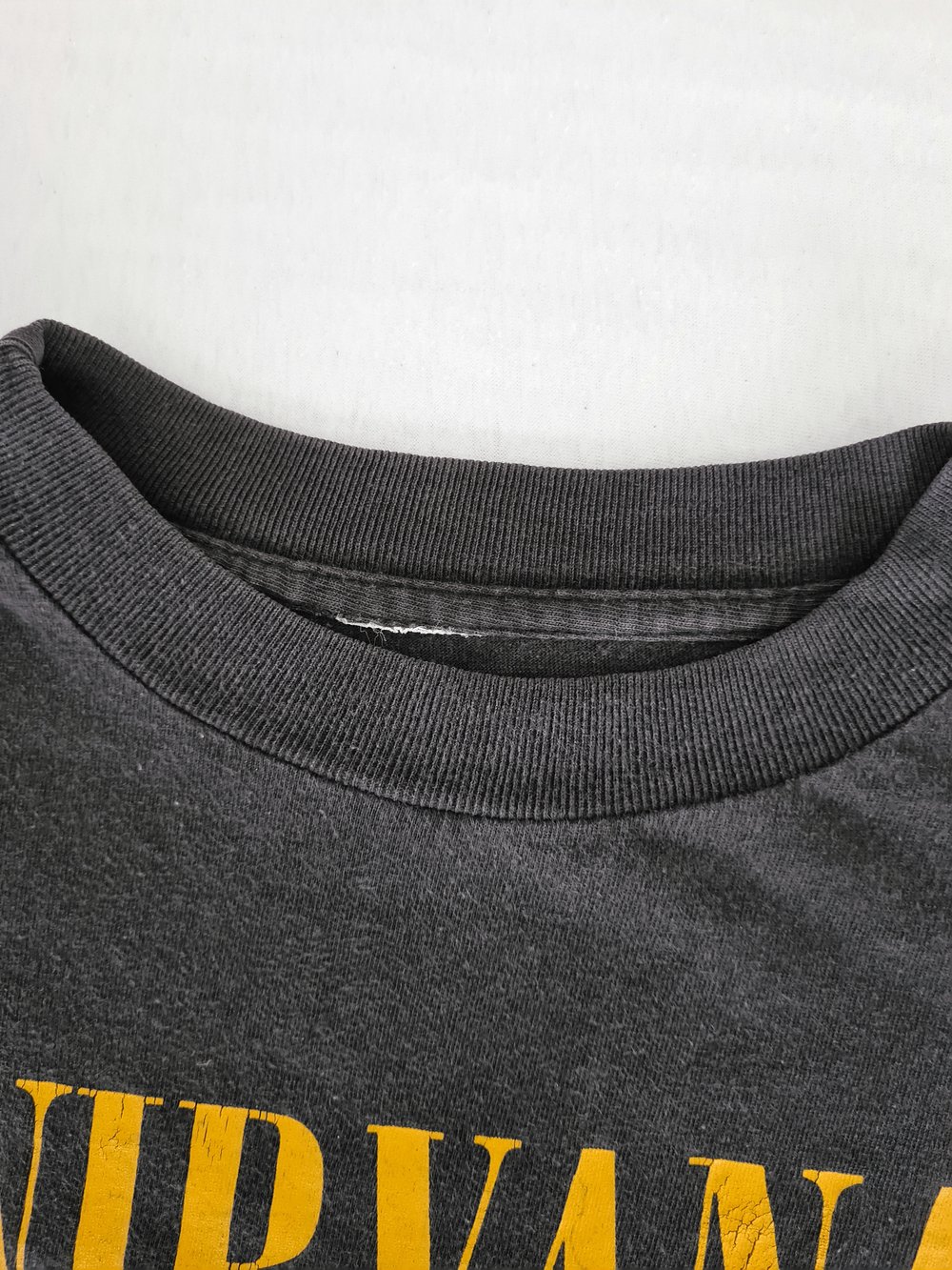 In good condition, given its age. There are no holes or stains on the shirt. The fabric feels heavyweight and soft. The hem has been partially repaired. Print shows minor cracking. Tag has been cut out but would have said approximately size XL.