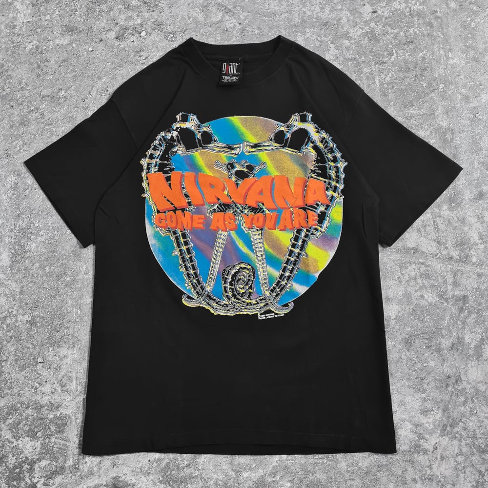 In mint condition, given its age. There are no holes or stains on the shirt. The fabric feels heavyweight and is single stitched. Print shows no cracking. Tag is from Giant by Teejays and says size L, fits XL too.
