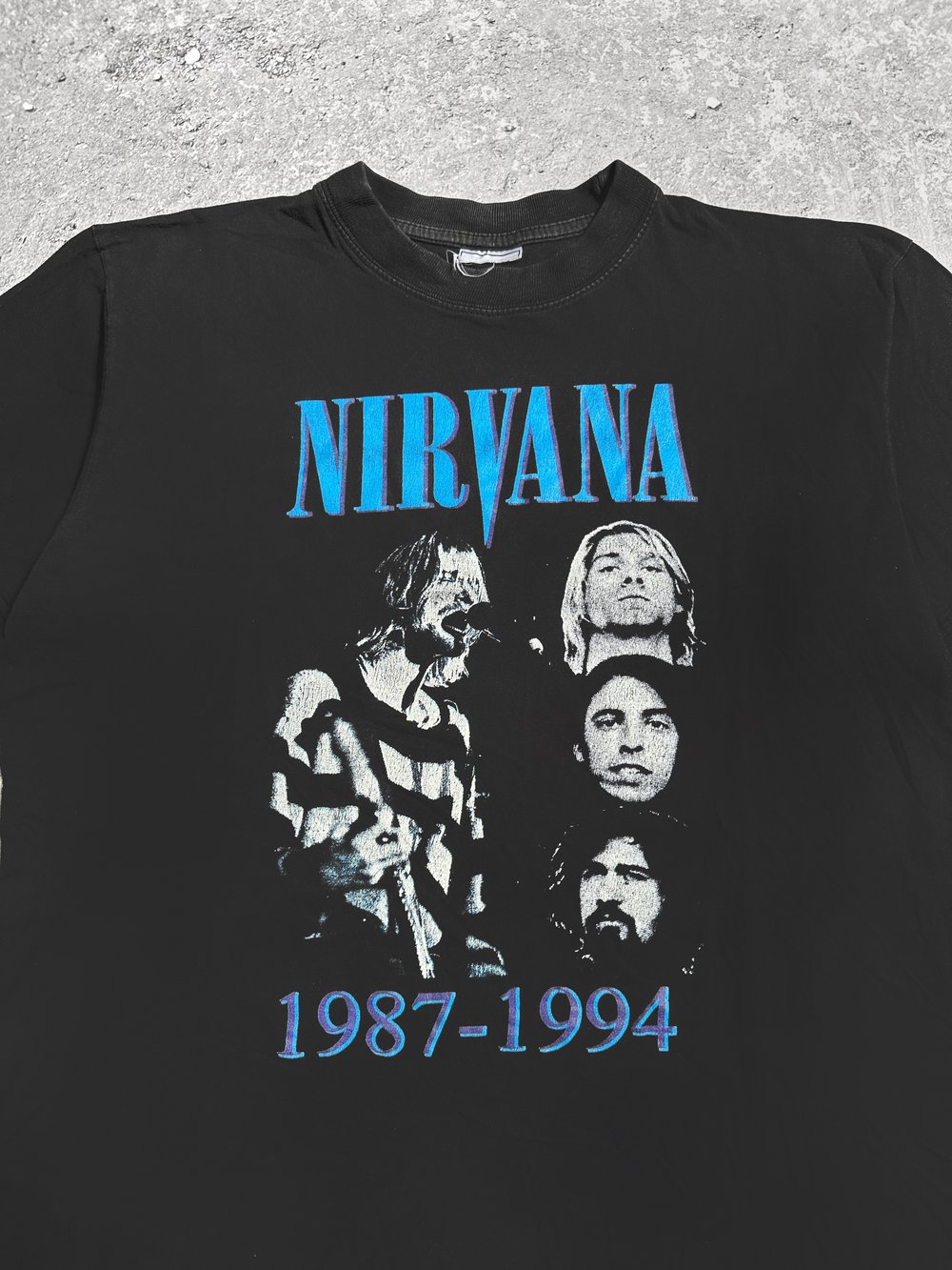 In good condition, given its age. There are no holes or stains on the shirt. The fabric feels soft and has slightly faded. Print shows minor cracking. Tag is blank and has been cut off, fits size L/XL.