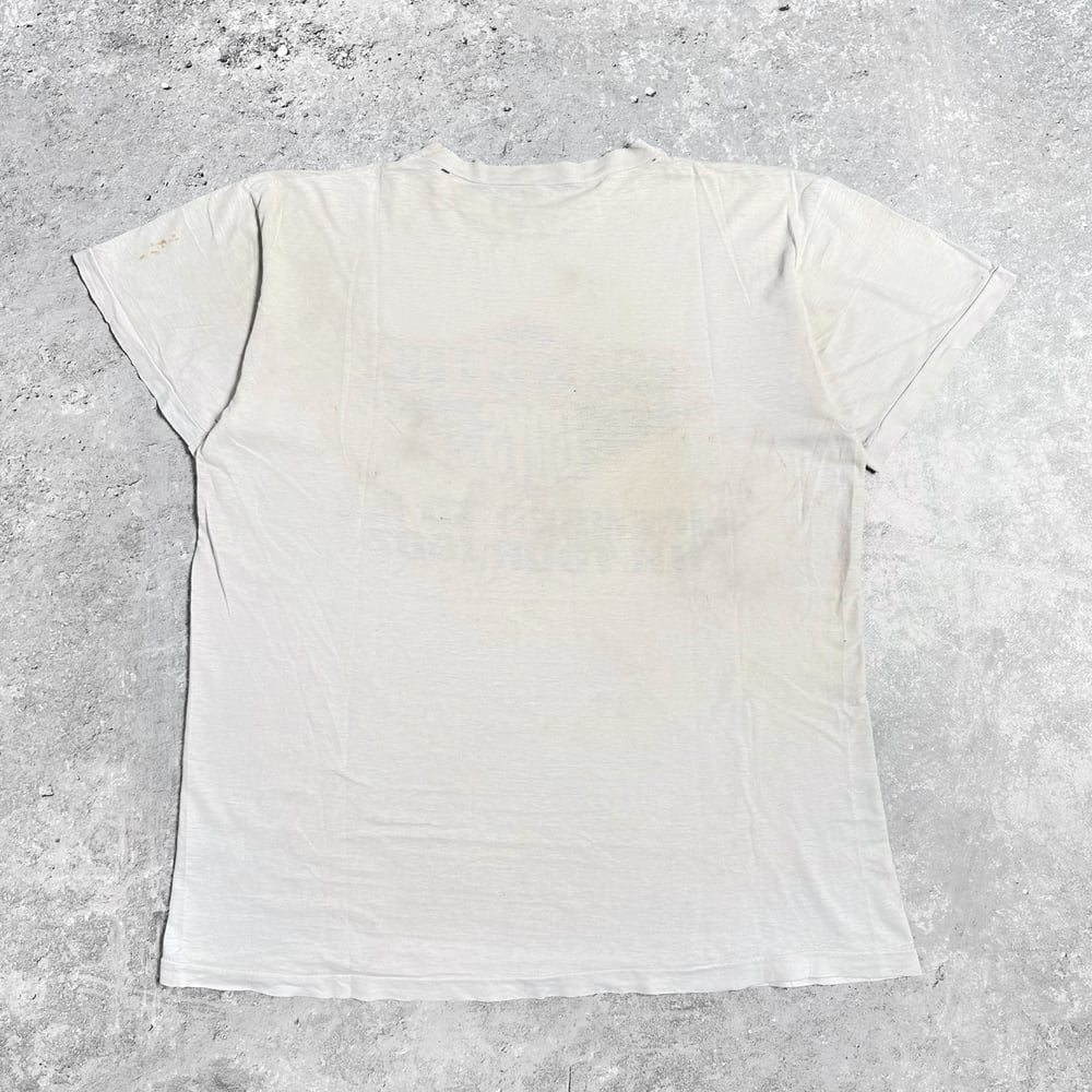 In trashed condition, with several small holes, stains, spots and fading to an off-white color. There is distressing throughout. The fabric feels drapy and is single stitched. Print shows heavy fading. Tag has been removed but fits approximately size M/L. Extremely hard to come by.