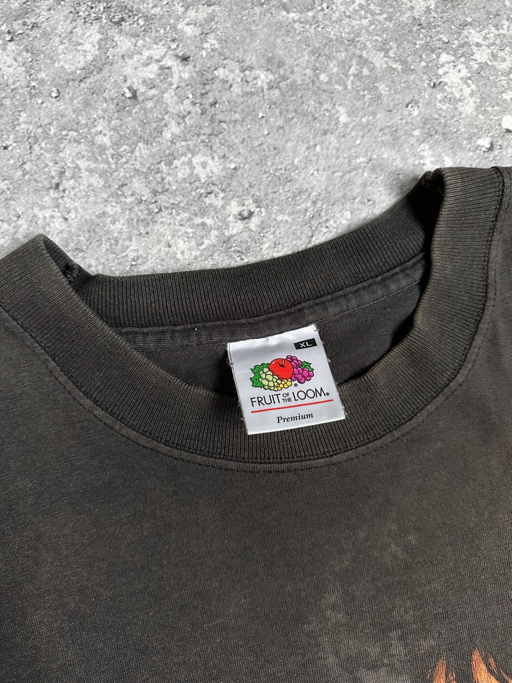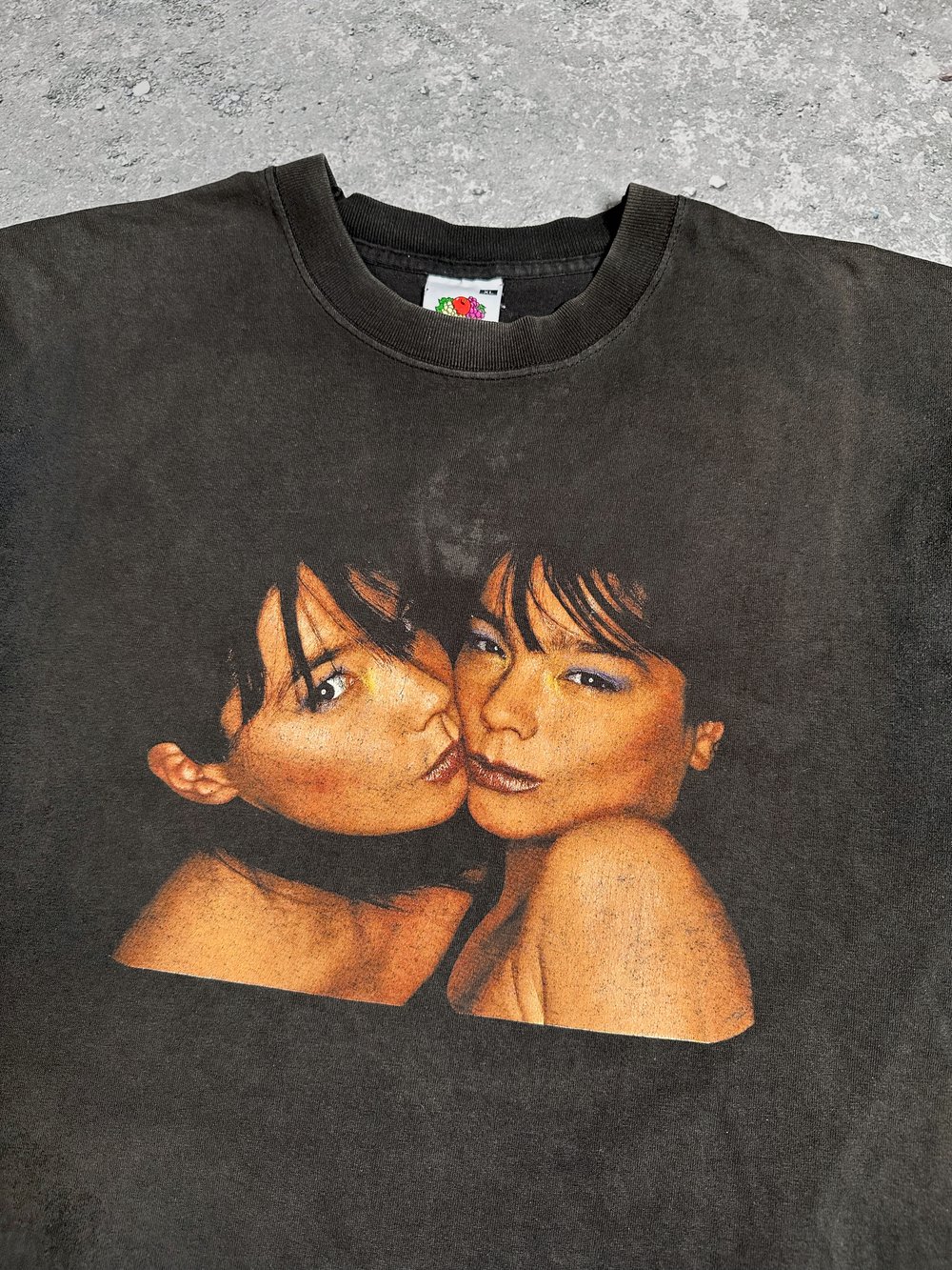In good condition, given its age. There are two small holes on the back of the shirt, and some marks (probably bleach marks) around the frontprint. The fabric feels heavyweight and has a slight fade. Print shows minor cracking. Tag is from Fruit of the Loom and says size XL. Bought in November 1997 at the Mutualité concert in Paris. This shirt was only sold on the Björk website and at very specific gigs. One of the rarest Björk shirts out there.