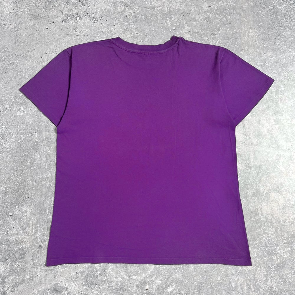 In good condition, given its age. There is a faded area on the front. The fabric feels heavyweight and is single stitched. Print shows minor cracking. Tag is from Anvil and says size L. Hard to come by.