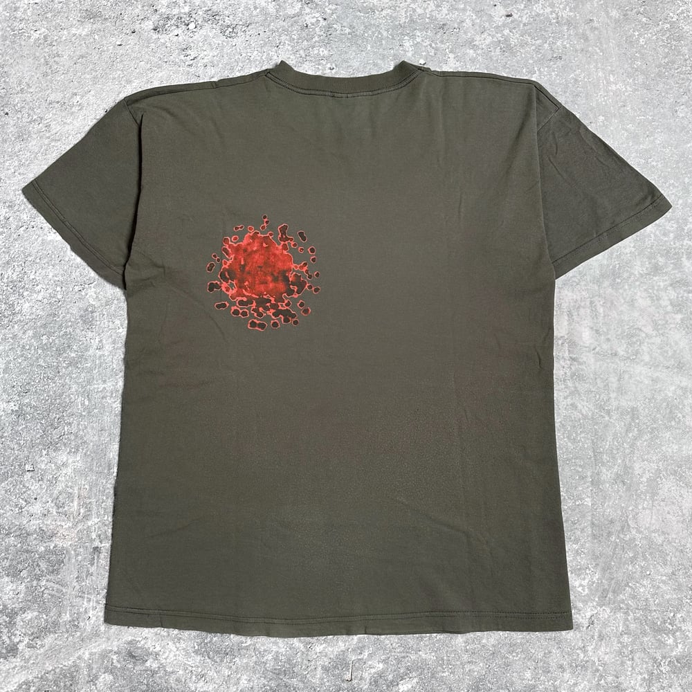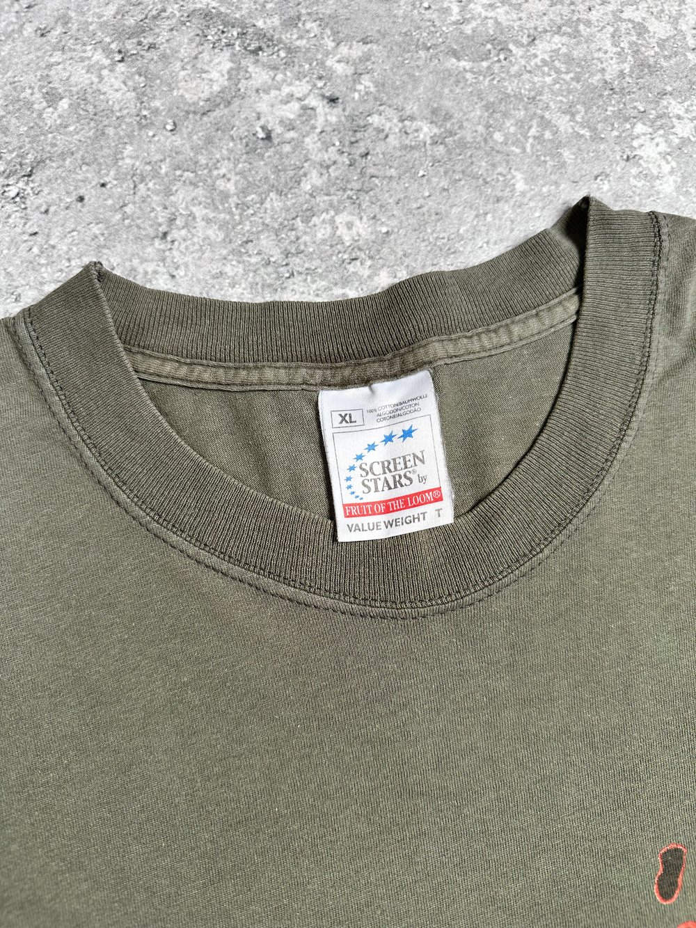 In good condition, given its age. There are some small pinholes on the shirt and an area on the back where the cotton is brushed (softer). This is an issue more often found on these specific shirts. The fabric has a khaki like colour. Print shows minor cracking. Tag is from Screen Stars and says size XL. Hard to come by.