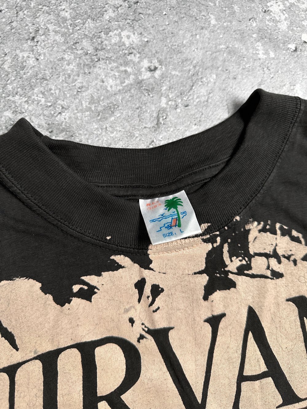 In good condition, given its age. There are some small holes but no stains on the shirt. The fabric feels drapy and soft. Print shows minor to no cracking. Tag is unknown and says size L. Very hard to come by.