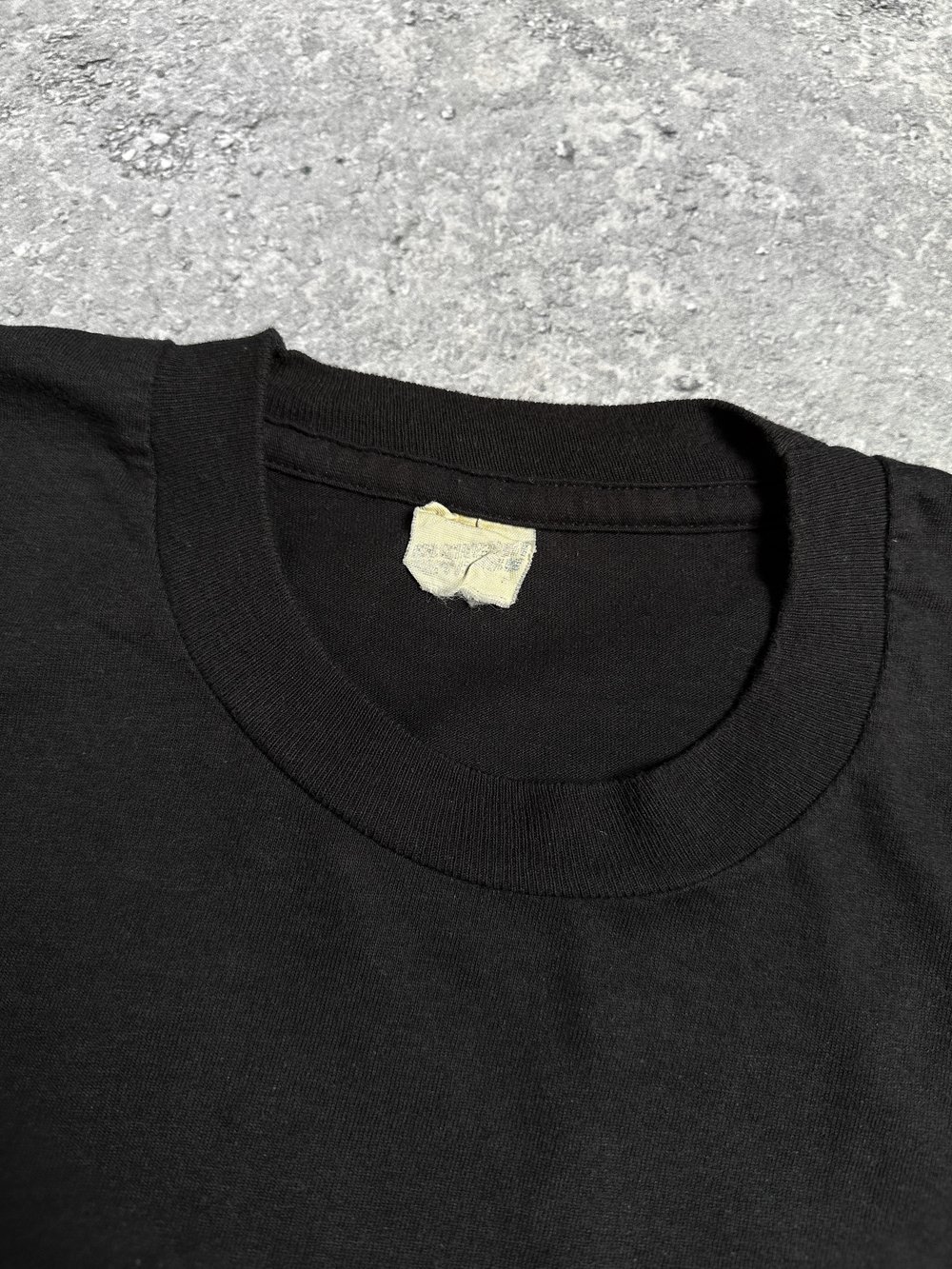 In great condition, given its age. There are no holes or stains on the shirt but there is a faded mark on one of the sleeves. The fabric feels soft and is single stitched. Print shows minor cracking. Tag is from Screen Stars and fits size XL.