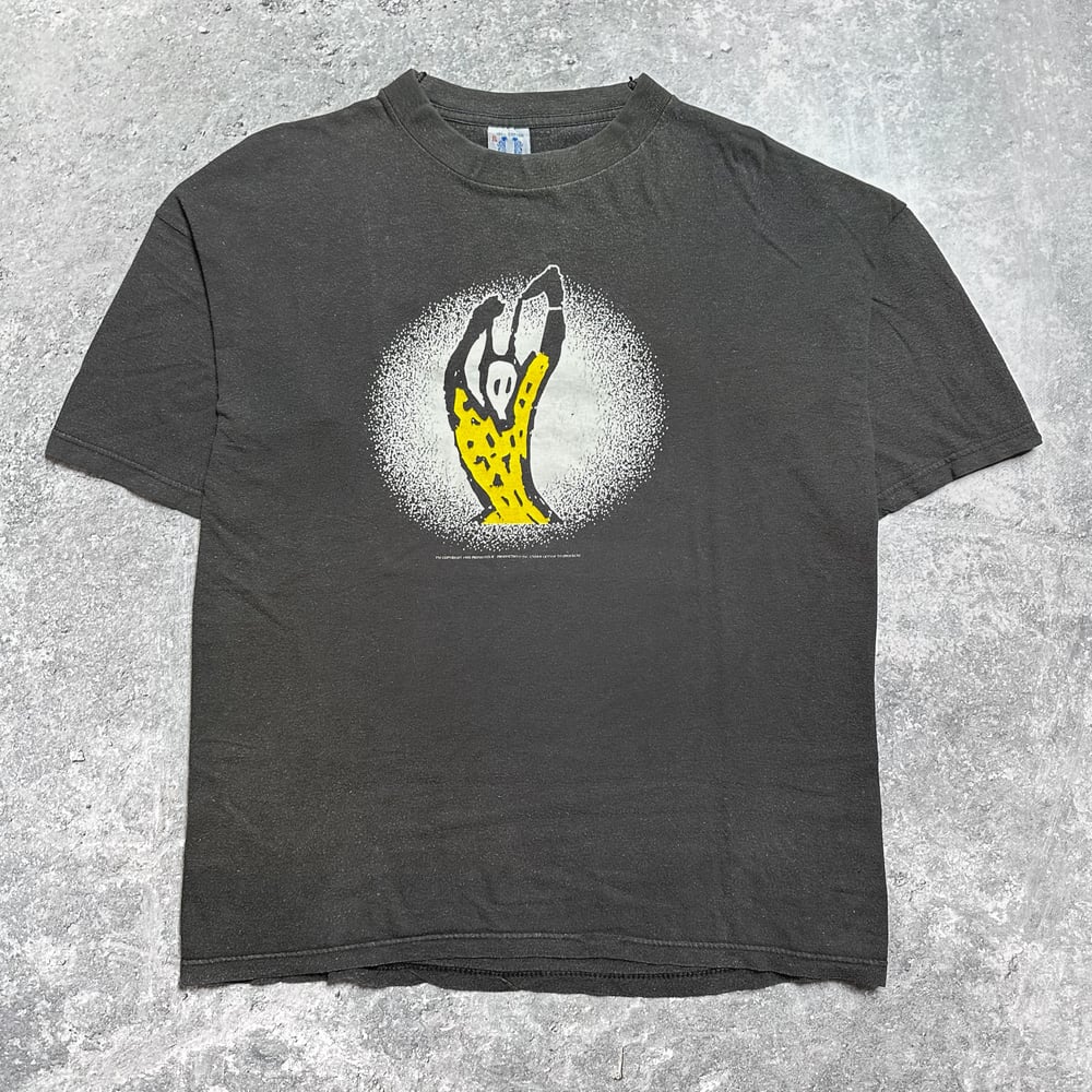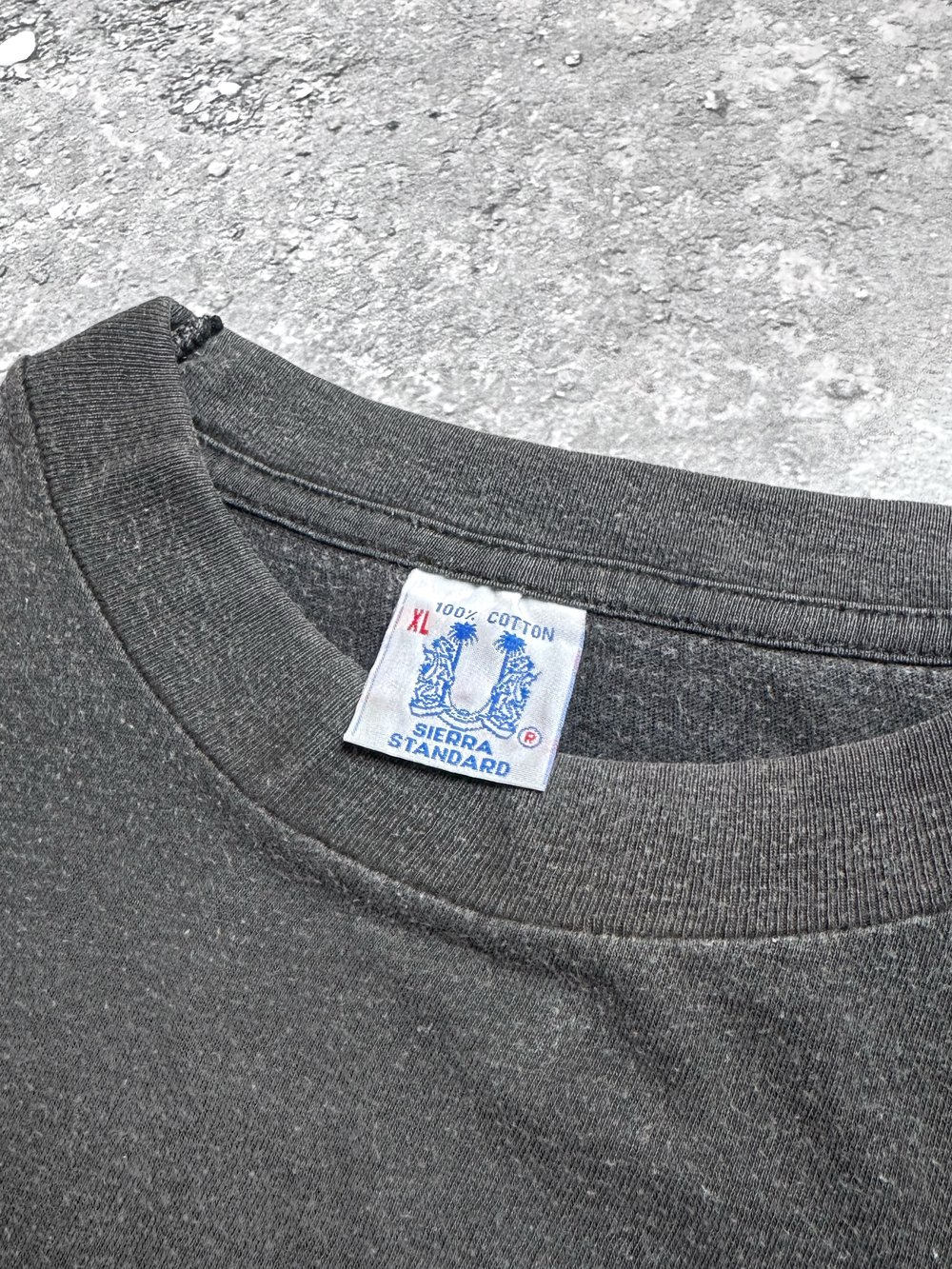 In great condition, given its age. There are no holes or stains on the shirt. The fabric feels soft and has slightly faded. Print shows minor cracking. Tag is from Sierra Standard and says size XL.