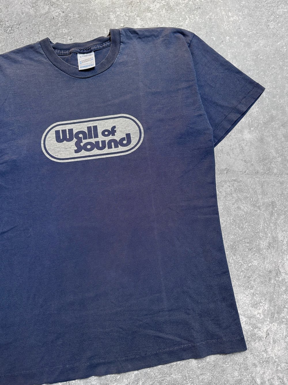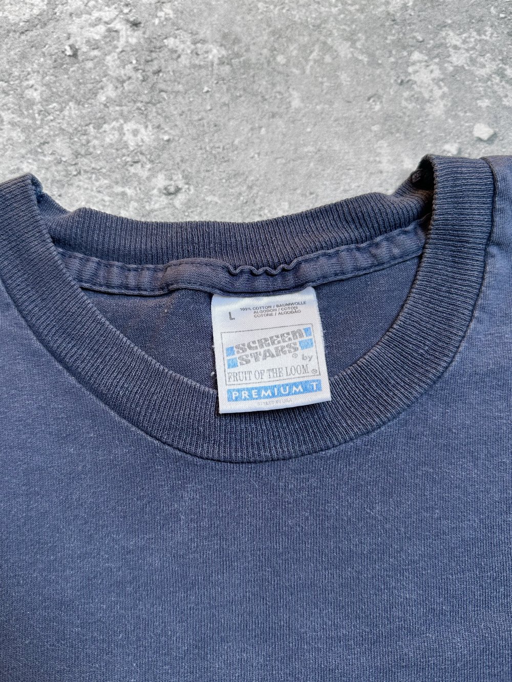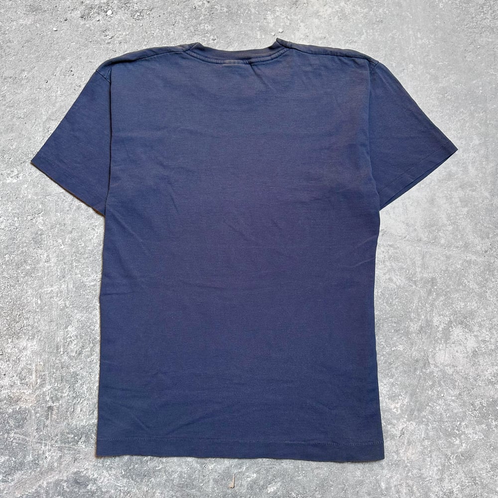 In good condition, given its age. There some tiny holes on the shirt. The fabric feels heavyweight, has slightly faded and is single stitched. Print shows minor cracking. Tag is from Screen Stars and says size L but also works for XL.