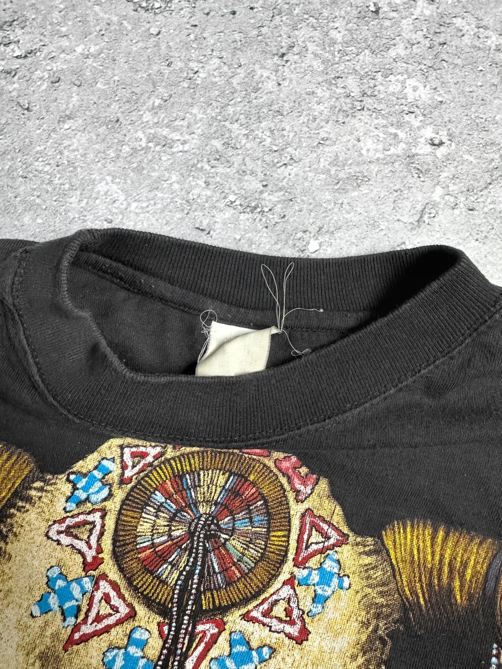 In good condition, given its age. There are no holes or stains on the shirt. The fabric feels soft and is single stitched. Print shows minor cracking. Tag has faded but fits size XL.